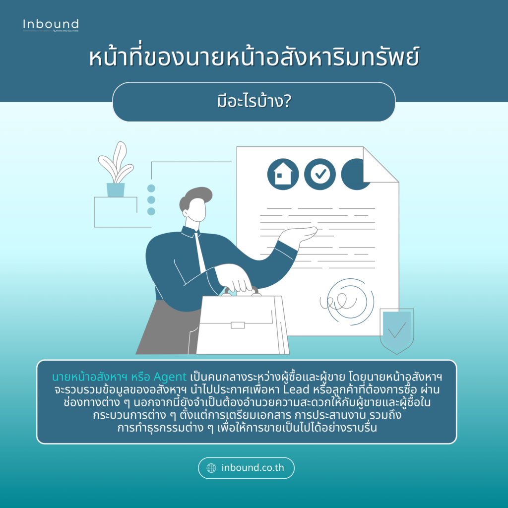 นายหน้าอสังหาฯ หรือ Agent เปรียบเสมือนเป็นคนกลางระหว่างผู้ซื้อและผู้ขายอสังหาฯ โดยนายหน้าอสังหาฯ จะรวบรวมข้อมูลของอสังหาฯ ที่ต้องการขาย นำไปประกาศเพื่อหา Lead หรือลูกค้าที่ต้องการซื้อ ผ่านช่องทางต่าง ๆ ทั้งออนไลน์และออฟไลน์ หากมีผู้ที่สนใจก็จะต้องนัดชมสถานที่ หากลูกค้าต้องการซื้อ ลำดับถัดไปก็จะเป็นการเจรจาเพื่อหาจุดที่พึงพอใจร่วมกัน และเริ่มทำสัญญาซื้อขาย อีกทั้งนายหน้าอสังหาฯ จำเป็นต้องอำนวยความสะดวกให้กับผู้ขายและผู้ซื้อในกระบวนการต่าง ๆ ตั้งแต่การเตรียมเอกสาร การประสานงาน รวมถึงการทำธุรกรรมต่าง ๆ เพื่อให้การขายเป็นไปได้อย่างราบรื่น
